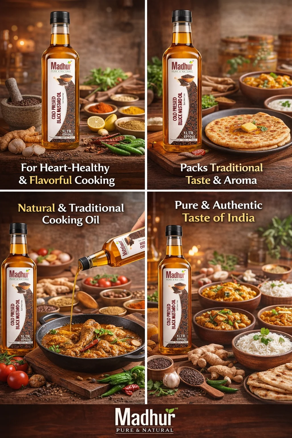 Every drop of Madhur Oil is cold-pressed, chemical-free, and unrefined, ensuring maximum nutrition, rich aroma, and authentic taste. From wholesome edible oils to therapeutic and wellness essentials, we bring you products that are clean, safe, and truly natural.