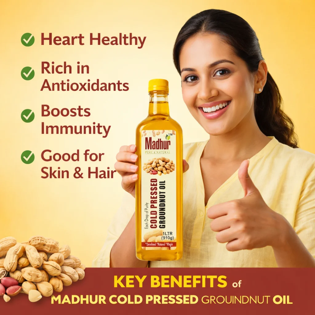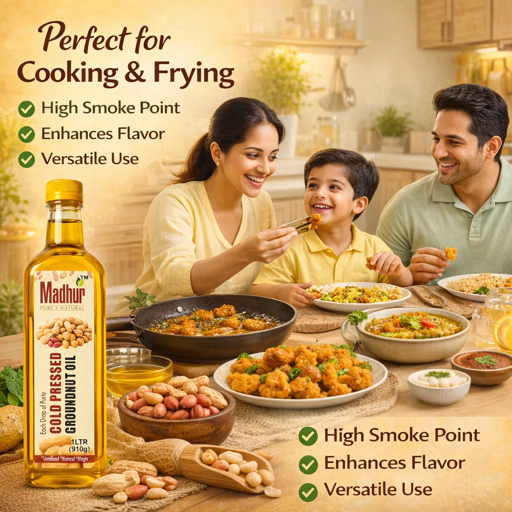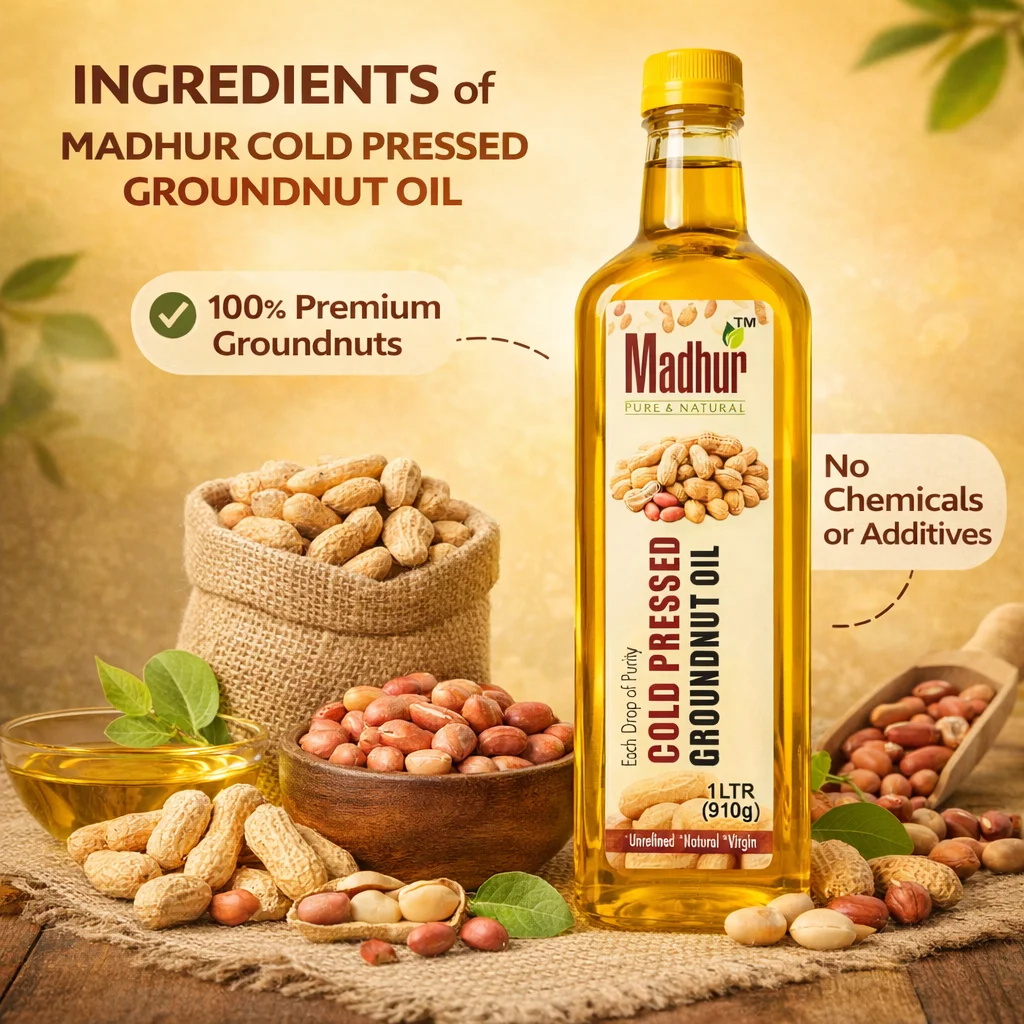 Madhur Cold Pressed Groundnut Oil is extracted from premium-quality peanuts using the traditional Kachhi Ghani (cold-pressed) method. This natural process preserves the oil’s original aroma, taste, and essential nutrients, making it a healthy choice for everyday cooking.