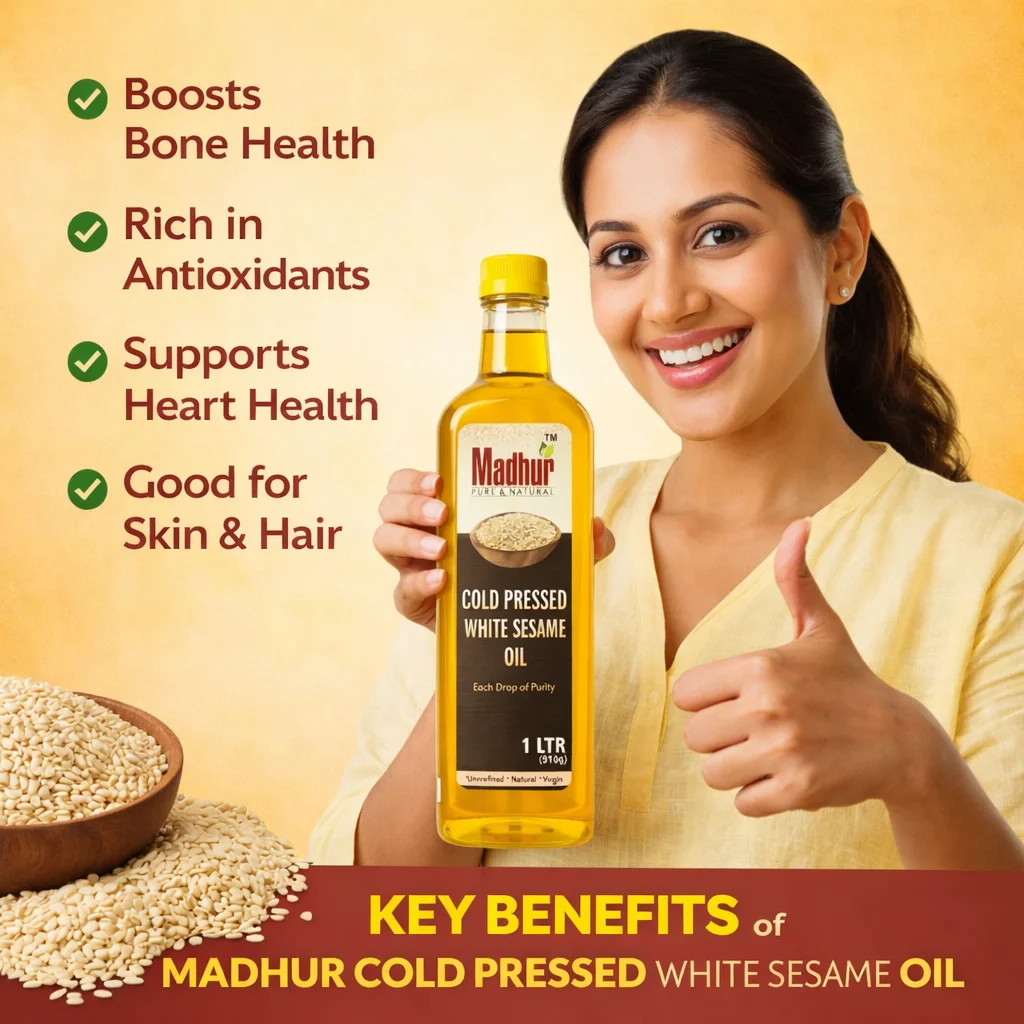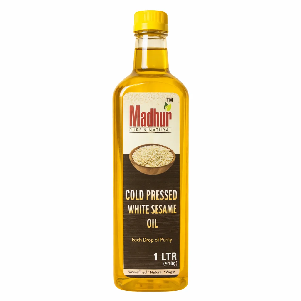 Madhur Cold Pressed White Sesame Oil is extracted from premium white sesame seeds using the traditional Kachhi Ghani (cold-pressed) method. This gentle process preserves the oil’s natural nutrients, aroma, and purity without using heat or chemicals.