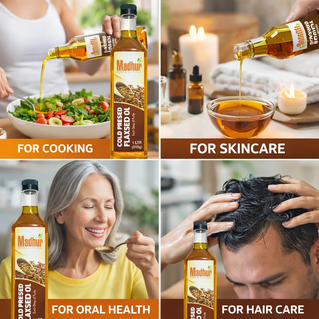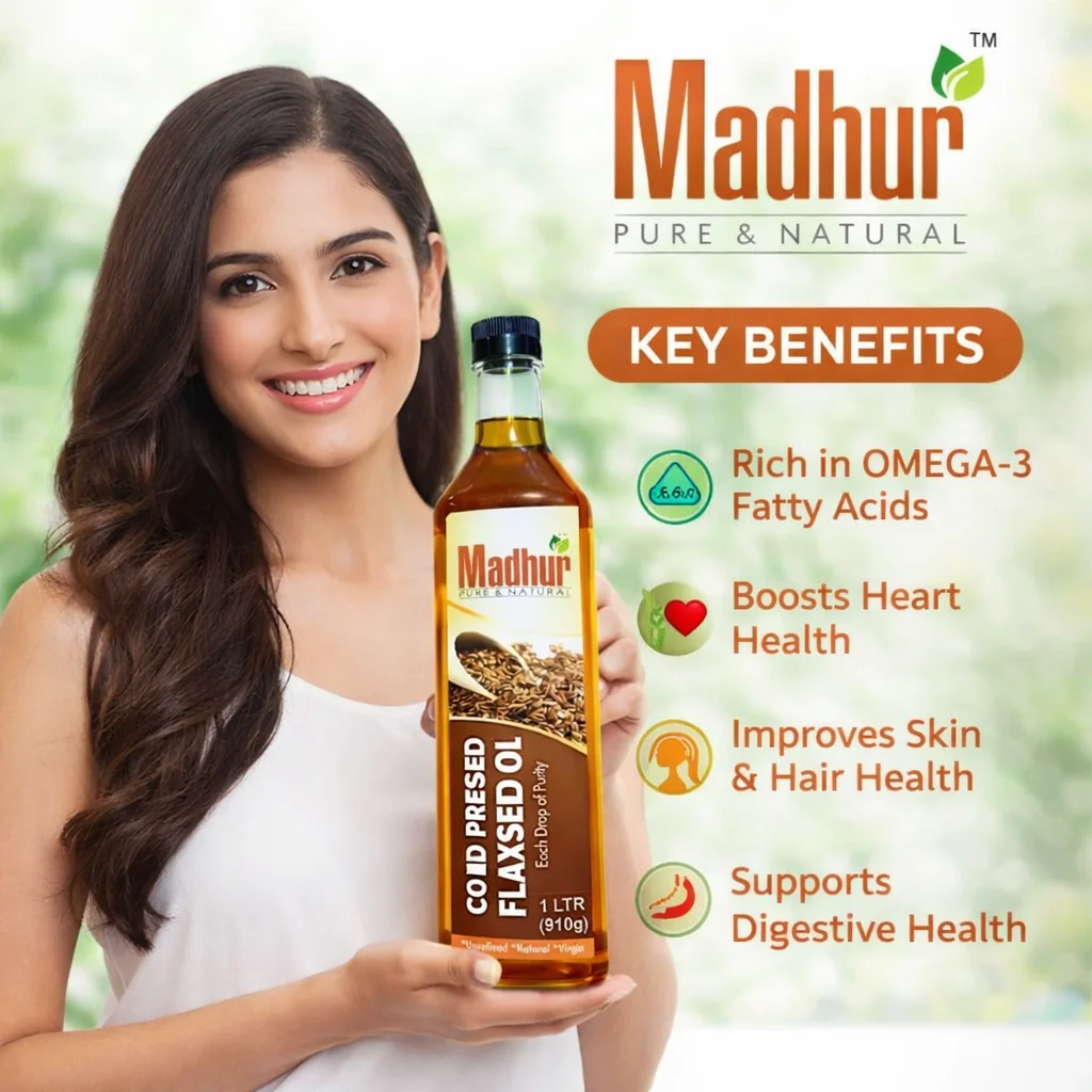 Madhur Cold Pressed Flaxseed Oil is extracted from high-quality flax seeds using the traditional cold-press method to preserve its natural nutrients, aroma, and purity. This unrefined and virgin oil is rich in Omega-3 fatty acids and essential nutrients, making it an excellent choice for a healthy lifestyle. Free from chemicals and additives, it is ideal for raw consumption, salad dressing, and wellness use.