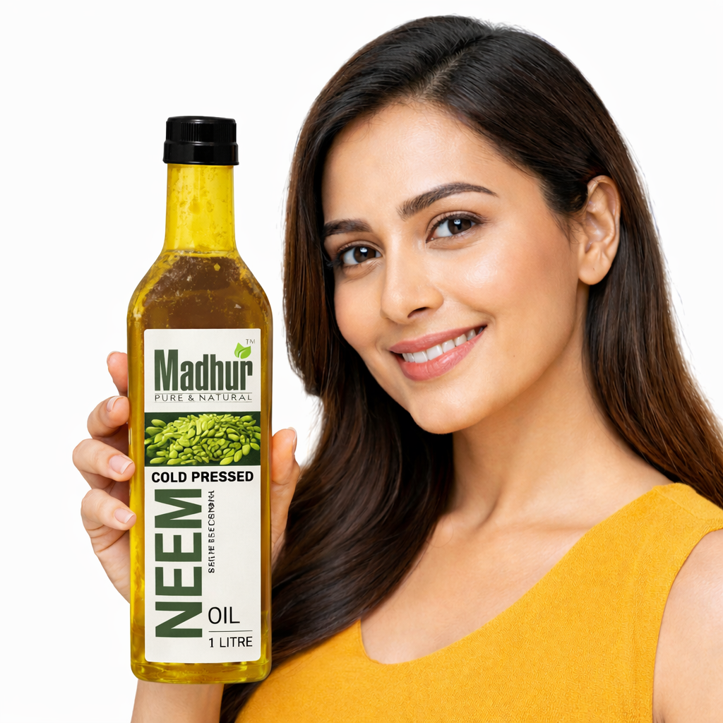 Madhur Cold Pressed Neem Oil is extracted from high-quality neem seeds using the traditional cold-press method to preserve its natural strength, nutrients, and bioactive compounds. Known for its powerful antibacterial, antifungal, and insect-repellent properties, neem oil has been used in Ayurveda for centuries. This 100% pure, unrefined oil is ideal for skin care, hair care, and natural household use. Free from chemicals, additives, and artificial fragrances.Key Benefits