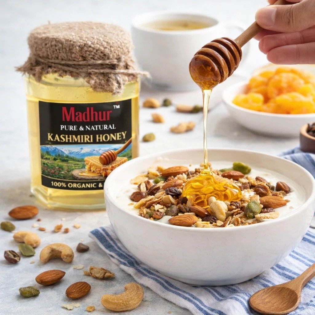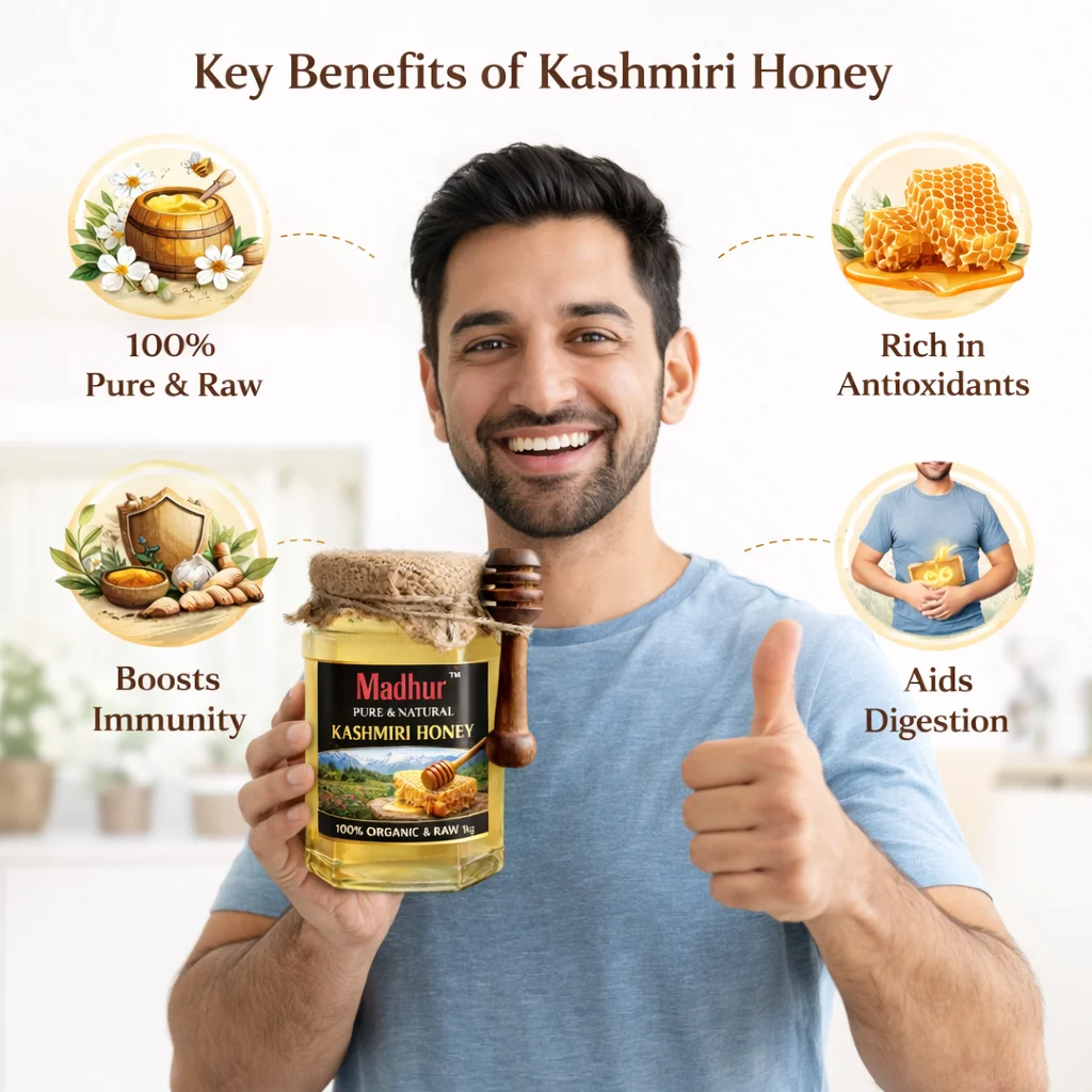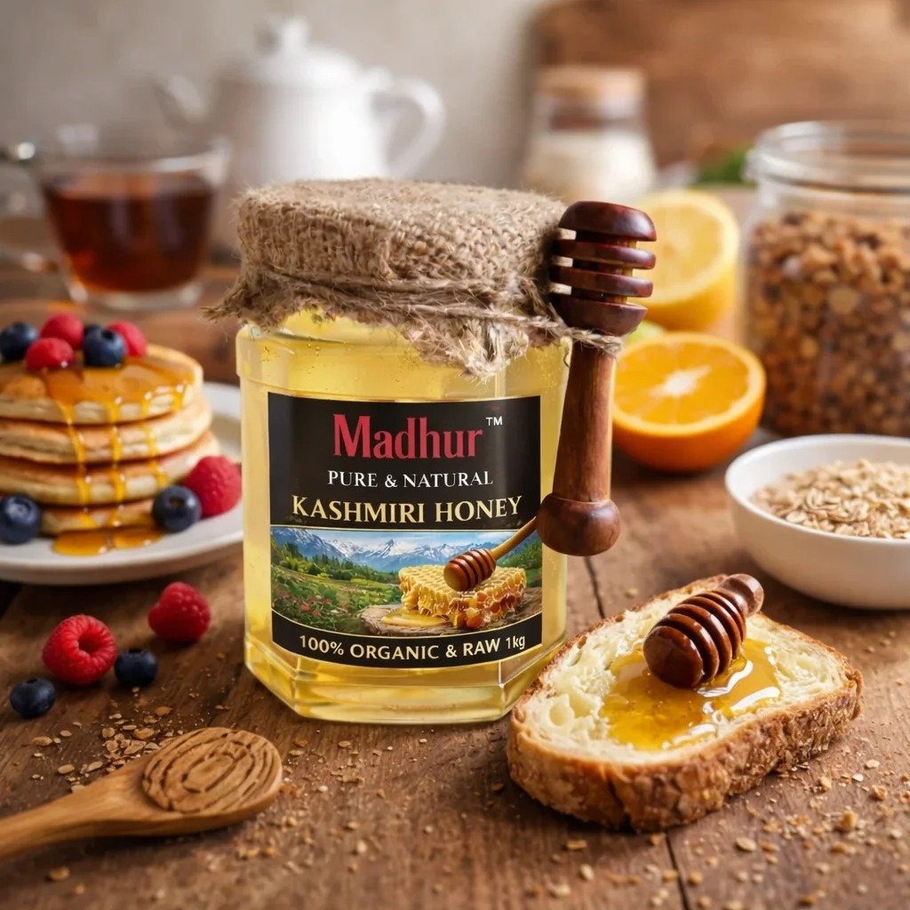Experience the richness of nature with Madhur Pure & Natural Kashmiri Honey, sourced from the pristine valleys of Kashmir. This 100% organic and raw honey is carefully extracted to preserve its natural enzymes, nutrients, and authentic taste. Free from added sugar, chemicals, and preservatives, Madhur Kashmiri Honey delivers pure goodness in every spoon.